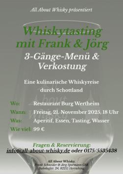 Es ist wieder einmal soweit: Ein weiteres spannendes Whiskytasting auf der Burg Wertheim erwartet Euch. Am 21. November 2025 brechen wir auf zu einer kulinarischen Whiskyreise durch Schottland.