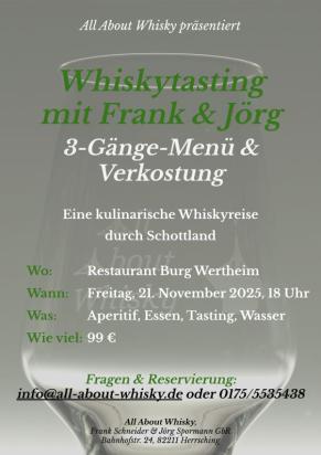 Enthalten sind das komplette Menü inklusive Wasser, Aperitif und fünf begleitender Whiskys mit je 2cl.